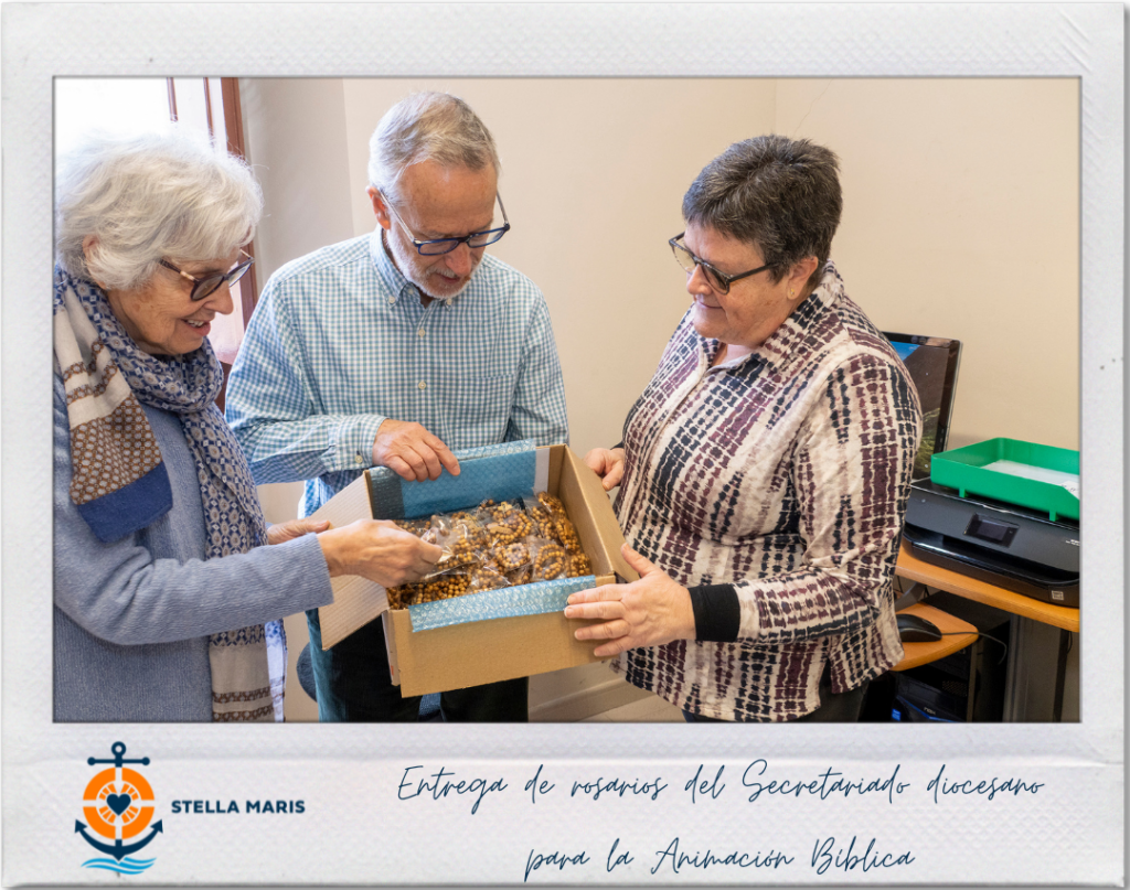 Ante la solicitud de rosarios para los marinos, el Secretariado diocesano para la Animación Bíblica realizó una donación de rosarios llegados desde Tierra Santa. El director de Stella Maris, Vicenç Veses, recibió la donación de manos de la responsable del secretariado, la Sra. Mª Esperança Amill. Otro de los grandes donantes de rosarios, en este caso hechos a mano, es el Sr. Joan Mitjans de l’Arboç.